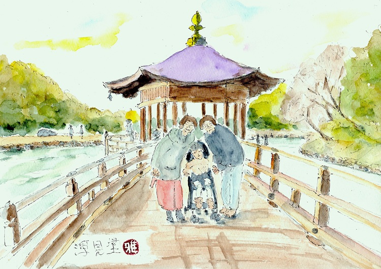 奈良公園・鷺池に浮かぶ檜皮葺の八堂形式(六角形)のお堂。春は桜、秋は紅葉、冬は雪景色と奈良らしい景色を彩る。